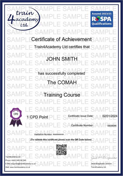Upon passing the online assessment you will have the options to both print and download your Control of Major Accident Hazards (COMAH) Certificate in PDF format. In addition to this an automated email will also be sent to your chosen email address containing a link to your certificate ensuring you always have access to a copy.