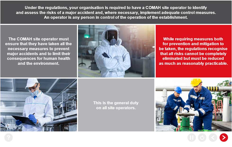 The aim of the training course is for learners to grasp an understanding of the regulatory requirements under the Control of Major Accident Hazards (COMAH) regulations, and apply this knowledge to a site or organisation to prepare and implement safety measures that prevent and mitigate major accidents involving hazardous substances.