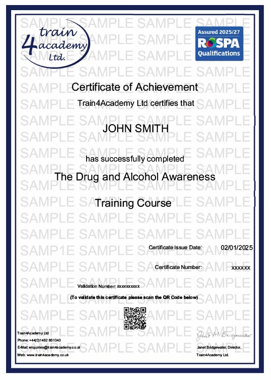 Upon passing the online assessment you will have the options to both print and download your Drug and Alcohol Awareness Certificate in PDF format. In addition to this an automated email will also be sent to your chosen email address containing a link to your certificate ensuring you always have access to a copy.