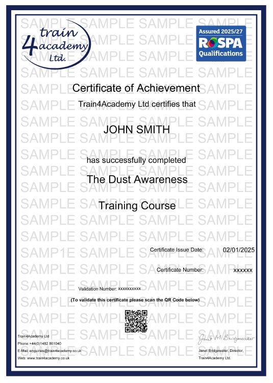 Upon passing the online assessment you will have the options to both print and download your Dust Awareness Certificate in PDF format. In addition to this an automated email will also be sent to your chosen email address containing a link to your certificate ensuring you always have access to a copy.
