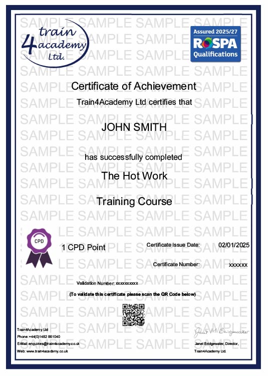 Upon passing the online assessment you will have the options to both print and download your Hot Work Certificate in PDF format. In addition to this an automated email will also be sent to your chosen email address containing a link to your certificate ensuring you always have access to a copy.