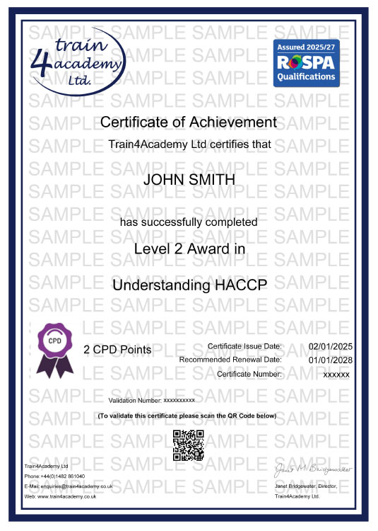 Upon passing the online assessment you will have the options to both print and download your Level 2 HACCP Training in Understanding Certificate in PDF format. In addition to this an automated email will also be sent to your chosen email address containing a link to your certificate ensuring you always have access to a copy.