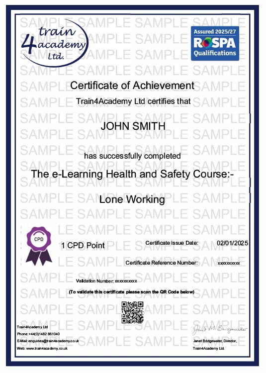 Upon passing the online assessment you will have the options to both print and download your Lone Worker Training Certificate in PDF format. In addition to this an automated email will also be sent to your chosen email address containing a link to your certificate ensuring you always have access to a copy.