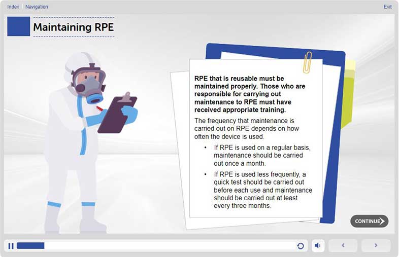 This final section covers using RPE and the requirements for safe use. Maintenance of RPE the frequency in which maintenance should be carried out and key tasks required. Roles and Responsibilities covers both employees and employers responsibilities for the safe and correct use of RPE.